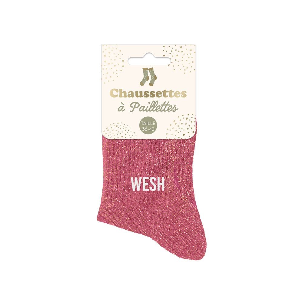 Avec leurs paillettes roses et la mention "Wesh" en blanc, ces chaussettes apportent une touche de peps et de décontraction à toutes vos tenues estivales.