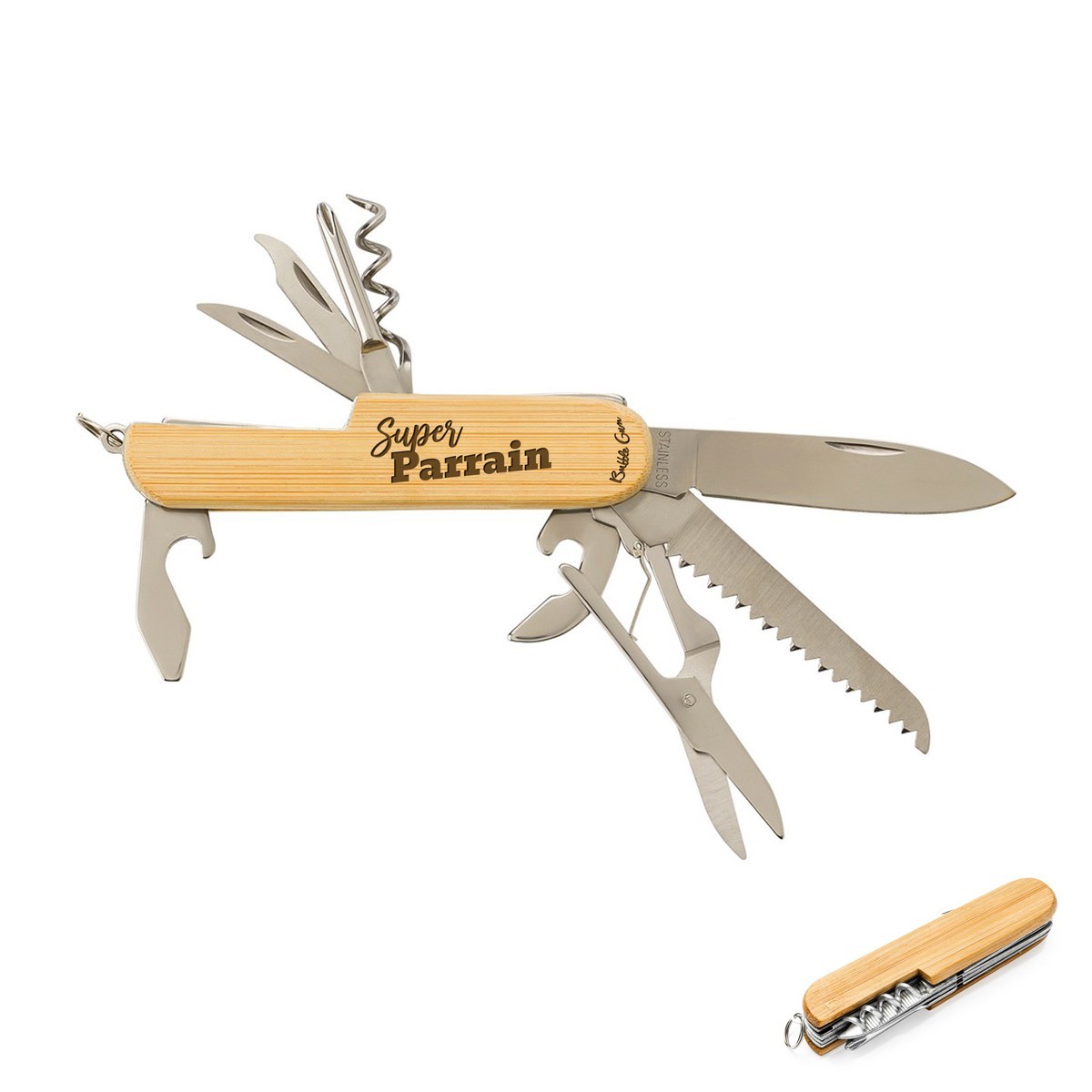 Découvrez le couteau multifonction "Super Parrain", l’outil ultra-pratique à glisser partout ! Avec 9 fonctions intégrées, il est conçu en bambou et métal pour allier durabilité et élégance.