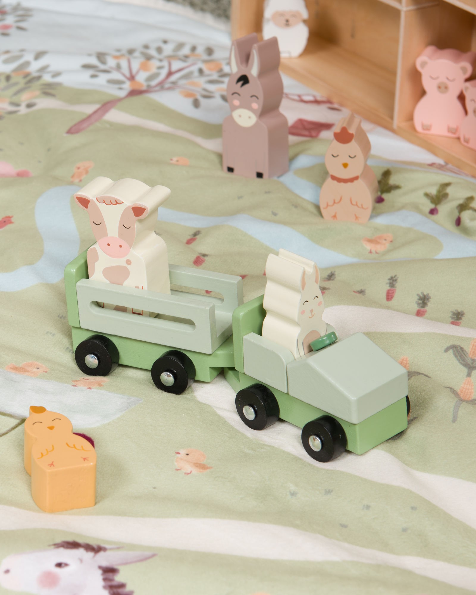 • Design charmant : Une grange en bois naturel et des animaux colorés (rouge, vert, blanc, rose, beige) pour stimuler l’imagination.